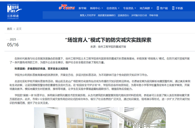 近日,我校土木工程学院依托国家防震减灾科普教育基地积极探索“场馆育人”模式,获新华网、中国新闻网深度报道。报道聚焦土木学院在科普宣教、安全实训、校地协同等领域的实践,充分肯定了学院将专业教育与社会责任深度融合的做法。