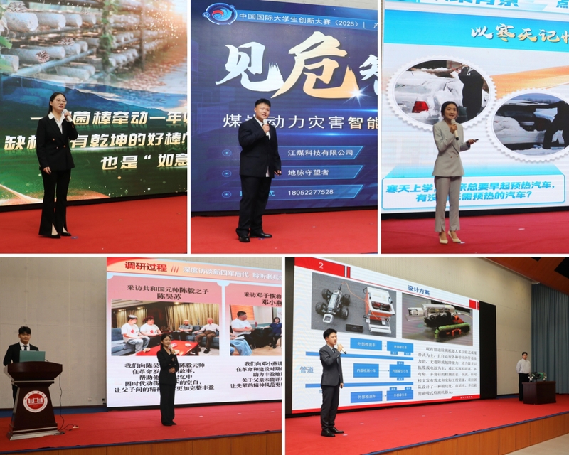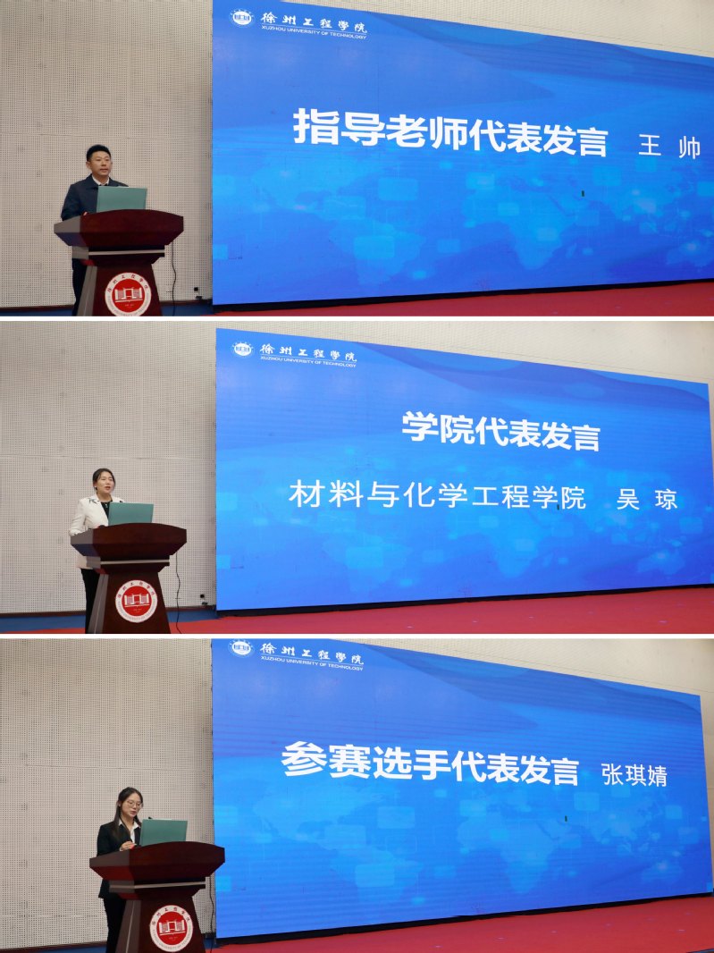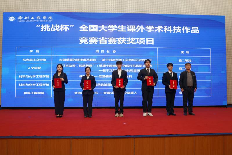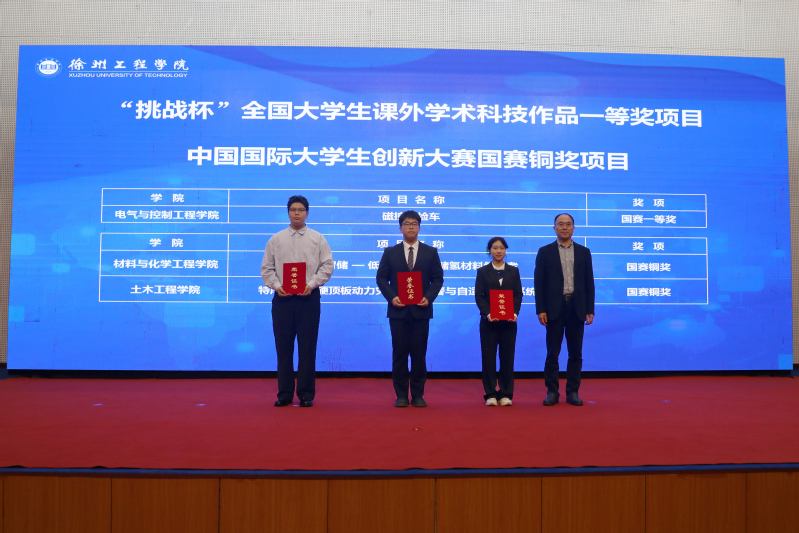 会上,校领导为在中国国际大学生创新大赛、“挑战杯”全国大学生课外学术科技作品竞赛中获奖的项目团队颁奖。食品与生物工程学院、电气与控制工程学院、材料与化学工程学院、土木工程学院、人文学院等5个获奖项目团队进行路演展示。参赛选手代表、指导教师代表、学院代表分别作交流发言,分享大赛获奖经验。