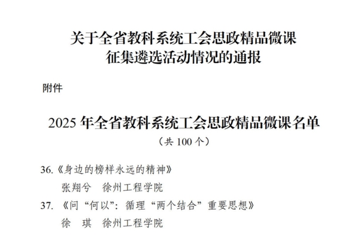 近日,省教科工会通报全省教科系统工会思政精品微课征集遴选活动结果,我校马克思主义学院张翔兮老师的作品《身边的榜样永远的精神》、徐琪老师的作品《问“何以”:循理“两个结合”重要思想》成功入选。