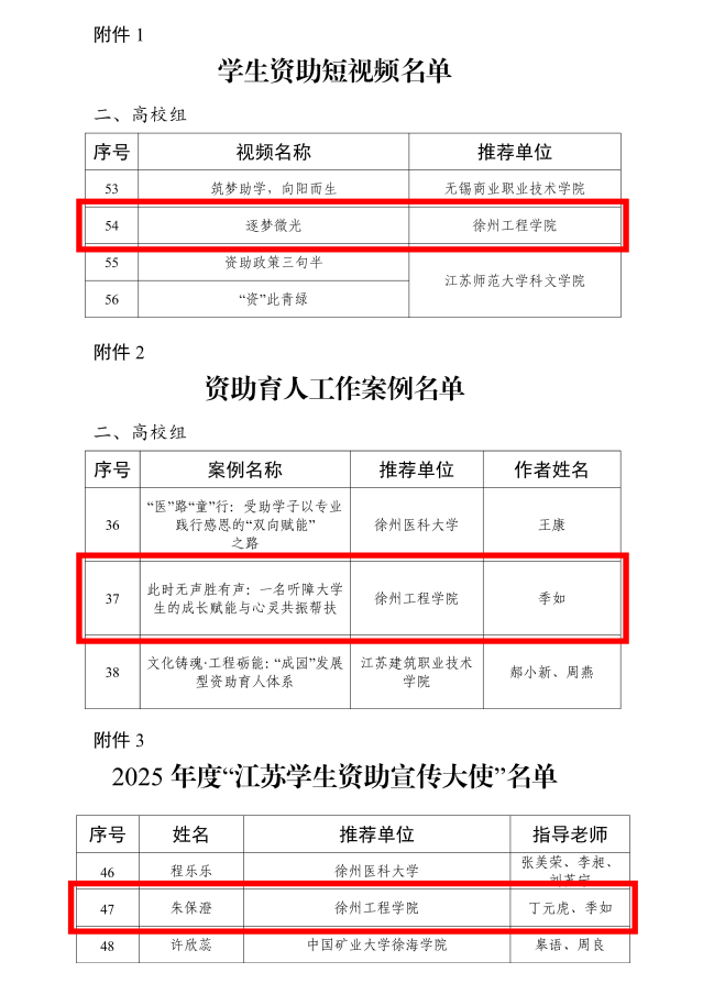 近日,江苏省教育厅组织开展的2025年“苏乡永助”资助育人主题活动评选结果揭晓。本次活动共设“学生资助短视频”、“资助育人工作案例”和“江苏学生资助宣传大使”三个评选项目。我校报送的作品及个人均入选,实现3个获奖类别全覆盖。其中,商学院2024级市场营销2班吴佳丽同学报送的短视频《逐梦微光》获评“学生资助短视频”;数学与统计学院季如老师报送的《此处无声胜有声:一名听障大学生的成长赋能与心灵共振帮扶》获评“资助育人工作案例”;金融学院2022级财务管理2班朱保澄同学获“江苏学生资助宣传大使”荣誉称号。