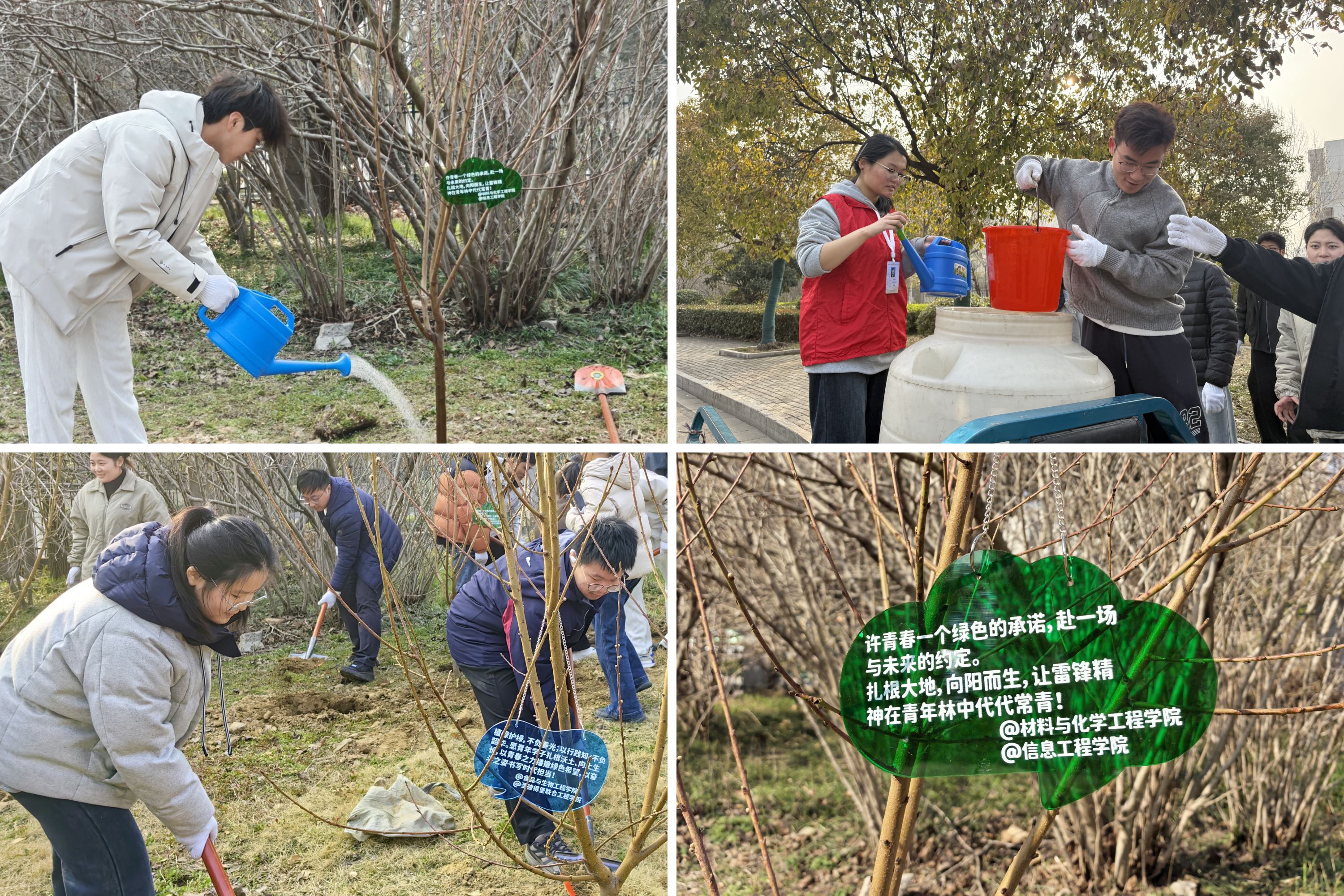活动现场春意勃发、干劲十足。师生分工明确、配合默契,挥锹挖坑、扶苗培土、踩实浇水,每一个环节都有条不紊、一丝不苟,一派热火朝天的劳动景象。18个二级学院结对撰写了青年成长寄语,悬挂于新栽种的桃树幼苗,为校园增添了盎然生机。活动现场还举行了“徐工院青年林”基地揭牌仪式,该基地的建立为常态化开展劳动教育,践行生态文明理念搭建了坚实平台。