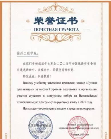 据了解,全国俄语奖学金项目由俄罗斯联邦教育部国际合作中心指导,ТРКИ中国俄语考试中心主办,北京对外教育科技中心承办,旨在促进俄语教学,激发高校俄语专业学生学习积极性。一直以来,圣彼得堡联合工程学院积极推进教育教学改革,以赛促教、以赛促学,多措并举提升学生俄语能力与素养,助力学生全面成长成才。