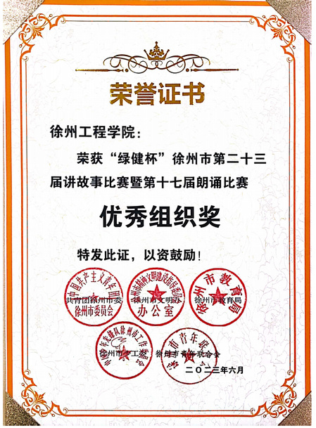 近日,由共青团徐州市委员会、徐州市文明办、徐州市教育局、徐州市少工委、徐州市青年联合会共同举办的“绿健杯 大国少年未来有我”第二十三届讲故事比赛暨第十七届诗歌朗诵比赛决赛在徐州市青少年宫举办。经过激烈角逐,我校王若玙、张鹏两位参赛选手荣获市个人组一等奖,《青春礼赞》、《五四的火炬》、《青春》、《钱树岩 战火芳华》四支队伍荣获市集体组一等奖,学校获评优秀组织奖单位。