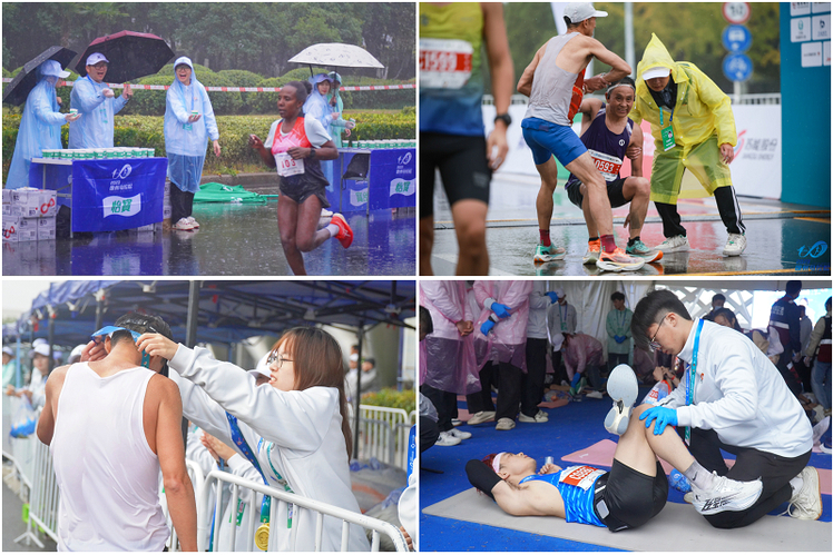 比赛当日凌晨5:30,我校志愿者们已全部集结并投放到点,有序进入工作模式。音乐加油站志愿者们在赛事沿途,不受风雨影响,利用啦啦操激情澎湃地为选手们呐喊助威、鼓掌加油;全程终点志愿者们以热情的欢呼和掌声庆祝参赛选手完赛,并为获奖选手佩戴奖牌、发放完赛物品、进行服务引导;赛后冰敷和拉伸的志愿者工作量尤为艰巨,志愿者们不厌疲倦,为运动员们送去暖心服务。直至下午3点,志愿者们始终以热情与活力助力赛事服务,凭借出色的表现赢得了赛事组委会和运动员们的高度认可。