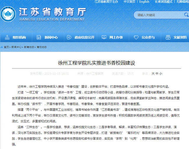 11月15日,省教育厅官网以“徐州工程学院扎实推进书香校园建设”为题,报道我校多措并举打造校园“悦读”新生态。