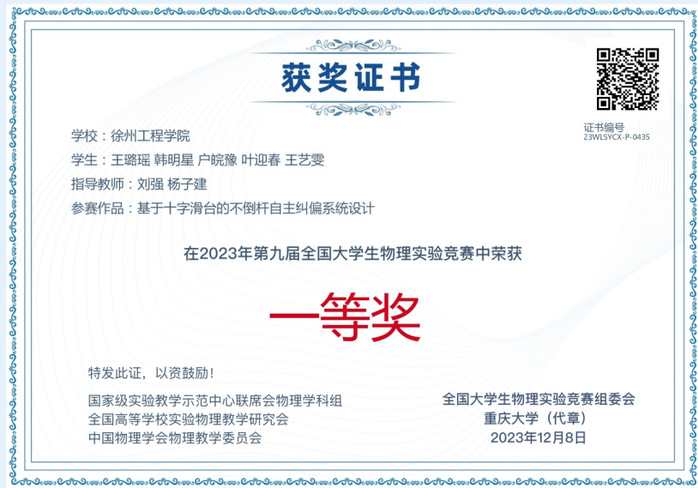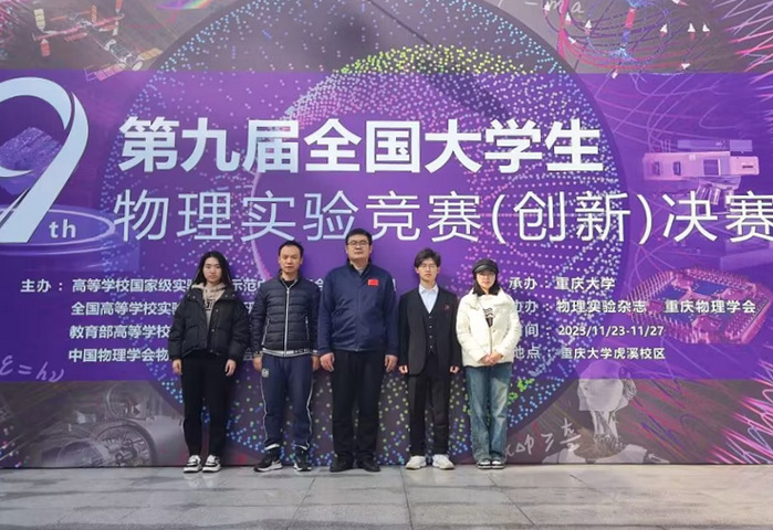 近日,第九届全国大学生物理实验创新竞赛决赛在重庆大学举行。我校物理与新能源学院的五支队伍共20名学生,经过省赛、全国初赛,层层选拔,最终代表学校进入本次决赛。经过为期4天的激烈角逐,共斩获一等奖1项、二等奖1项、三等奖2项,其中作品《基于十字滑台的不倒杆自主纠偏系统设计》荣获一等奖,作品《基于Python的光 学仿真实验平台》荣获二等奖,作品《改进电极-伏安法测量海水的导电特性》和《变温液体粘滞系数测量仪的设计》荣获三等奖,我校荣获优秀组织奖。