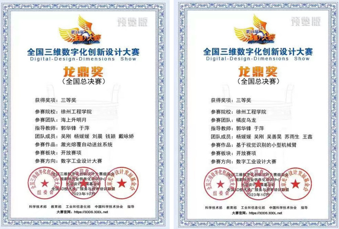 近日,第16届全国三维数字化创新设计大赛全国总决赛获奖榜单揭晓。机电工程学院杨媛媛、吴刚、吴善昊、苏雨生、王鑫、刘晨等同学在郭华锋、于萍老师指导的《激光自动送丝熔覆系统》和《基于视觉识别的小型机械臂设计》两项作品,均获全国总决赛三等奖。