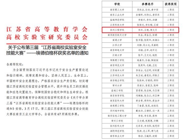 近日,第三届江苏省高校实验室安全技能大赛在南京工业大学举办。本次大赛共有67所省内高校参赛,我校由朱玲、王艳、窦文月三位老师组成的代表队在赛前精心准备,在赛中沉着应对,喜获大赛二等奖。