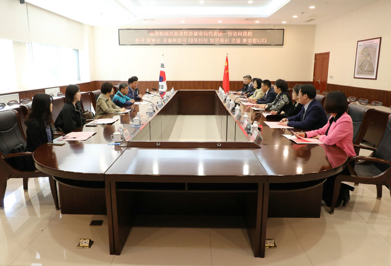 4月18日,韩国昌原市经济就业局局长金贤守一行5人来访我校。徐州市人民政府外事办公室副主任宋莉莉、美亚处处长朱静随行。副校长曹杰会见代表团。国际交流合作处、外国语学院、人文学院、金融学院负责人参加活动。