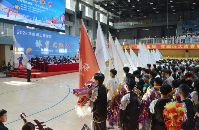 4月24日下午,由校体育运动委员会主办,体育学院承办的2024年徐州工程学院“体育文化节”开幕式在校体育馆举行。副校长、校体育运动委员会主任曹杰、王逢博出席开幕式。校体育运动委员会全体委员、学生代表、运动员、裁判员共计1200余人参加。体育学院党总支副书记陈益群主持开幕式。