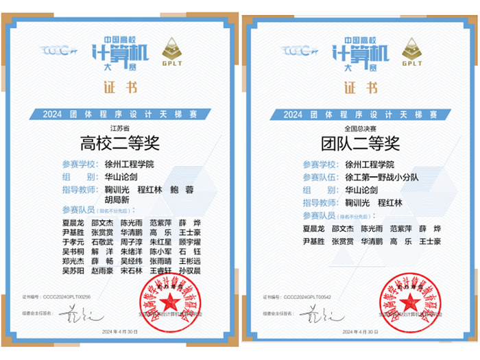 近日,第九届中国高校计算机大赛——团体程序设计天梯赛总决赛落下帷幕,本次比赛有来自北京大学、南京大学、浙江大学等全国580所高校的1800多支队伍18000多位学生参赛。我校信息工程学院选派50名学生组成5支代表队参加本次比赛。经过激烈角逐,在普通本科 “华山论剑”组中,邵文杰、夏晨龙等30名学生组成的3个团队分获总决赛全国团队二等奖1项、三等奖2项,另获江苏省高校团体二等奖1项(高校团体奖排名江苏普通本科4/36,位列全国普通本科66/461名)、个人国奖9项。