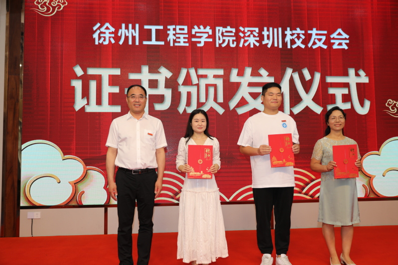 刘洋书记为99届房建专业校友、深圳市时峰建设工程有限公司董事长唐世超颁发会长证书,授予会旗,共同为深圳校友会揭牌。李苏北副书记宣读徐州工程学院深圳校友会成立批复,为理事会成员颁发证书。唐世超代表深圳校友会聘请我校老教师潘戈为名誉会长,并作表态发言。2002届给排水专业张业伟作筹备工作报告,介绍了深圳校友之家建设情况。